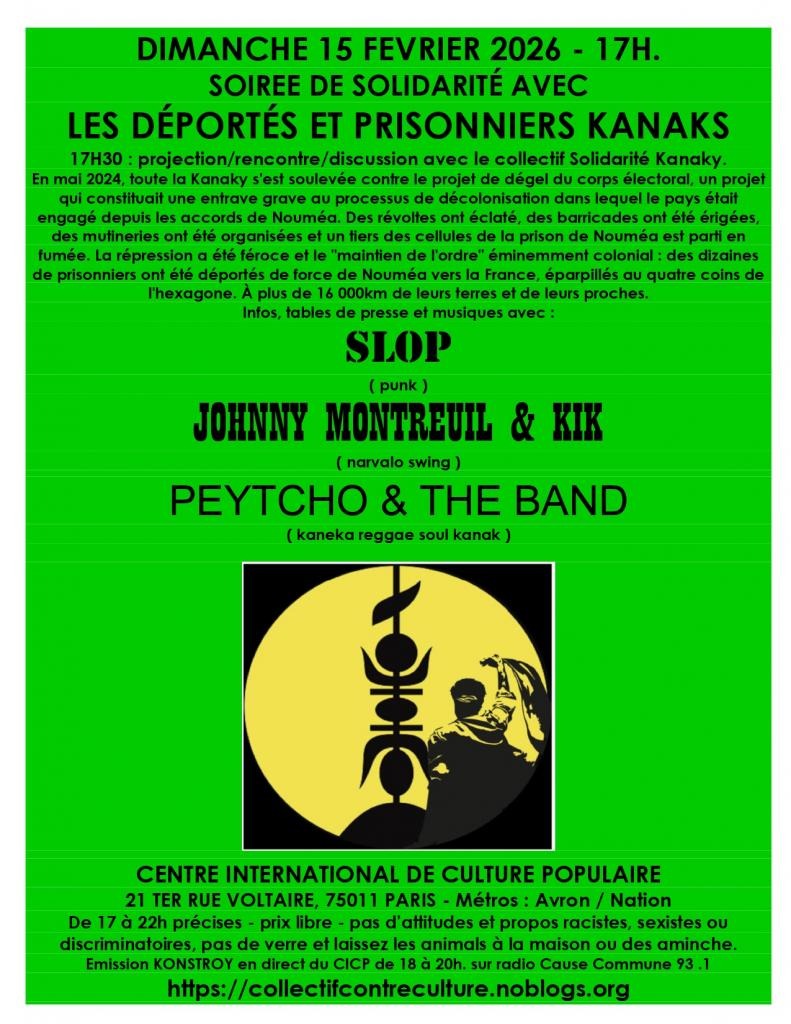Paris 11ème - Dimanche 15 février 2026 - 17h à 22h - Soirée de solidarité avec les déportés et prisonniers kanaks