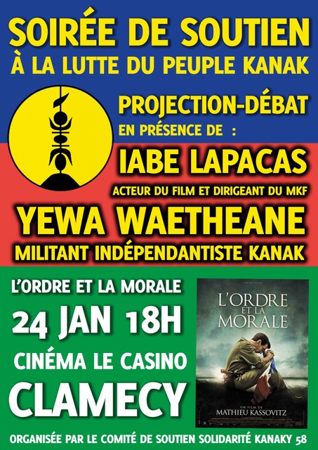 Le samedi 24 janvier 2026, à 18h, le Collectif Solidarité Kanaky de la Nièvre organise avec le cinéma municipal Casino de Clamecy une projection du film « L’ordre et la morale » de Mathieu Kassovitz. Ce film met en scène le massacre de la grotte d’Ouvea en Nouvelle Calédonie en 1988 : le gouvernement Chirac-Pons ordonne l’assaut avec gendarmerie, armée et GIGN sur la grotte où sont détenus en otages des gendarmes mobiles par des indépendantistes kanak. 12 sur 19 preneurs d’otages sont tués lors ou après l’assaut, le meneur Dianou meurt sans soins. Ces évènements sont un point culminant dans la longue lutte des kanak pour leur indépendance. Ils sont dans la mémoire de chaque kanak jeune ou plus âgé qui, presque 40 ans après ce massacre, poursuivent cette lutte.
